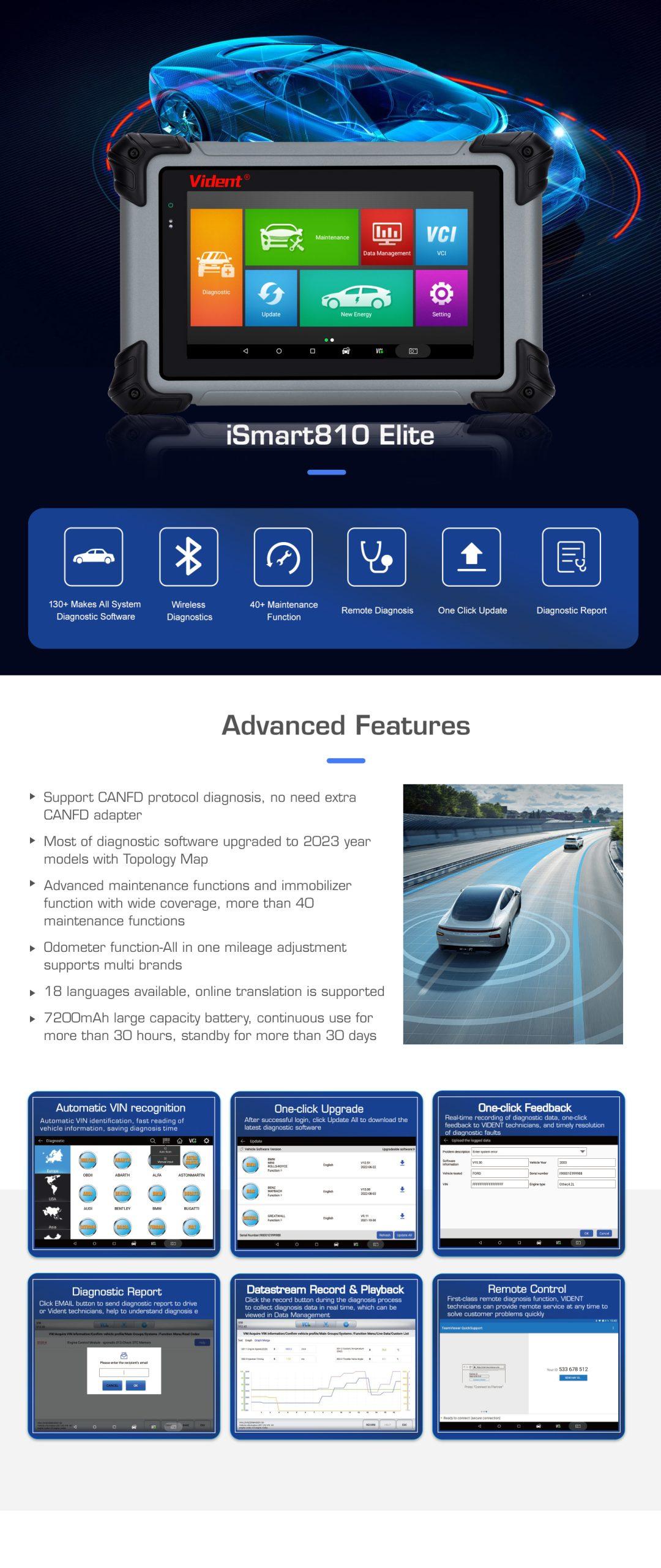 The iSmart810Elite auto diagnostic scanner is Vident newly launched automotive diagnostic scanner for 12V passenger vehicles, which can be applied to most vehicle brands in global market. With user-friendly Android interface and wireless diagnostic connections, the iSmart810Elite supports all systems ECU diagnosis for 130+ car makes, as well as 40+ commonly used service functions to make the mechanic's work more efficient and easier. We aim to provide affordable super maintenance auto diagnostic scan tool for worldwide workshop mechanics, a reliable device leading to easy work!